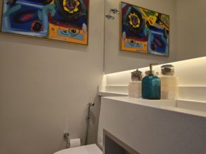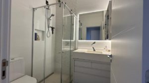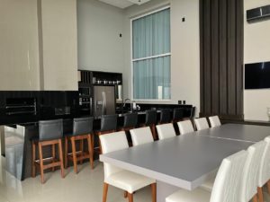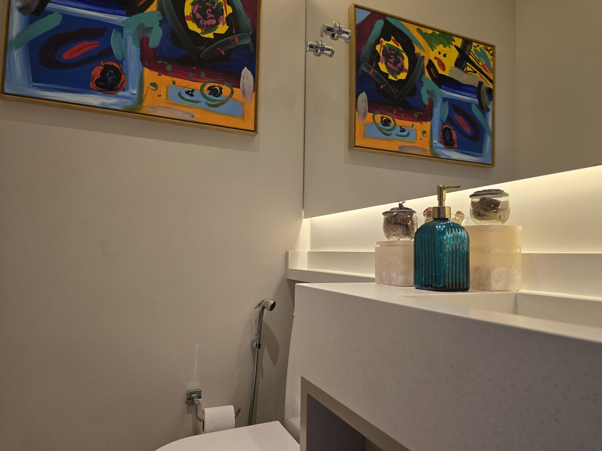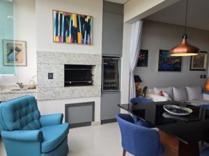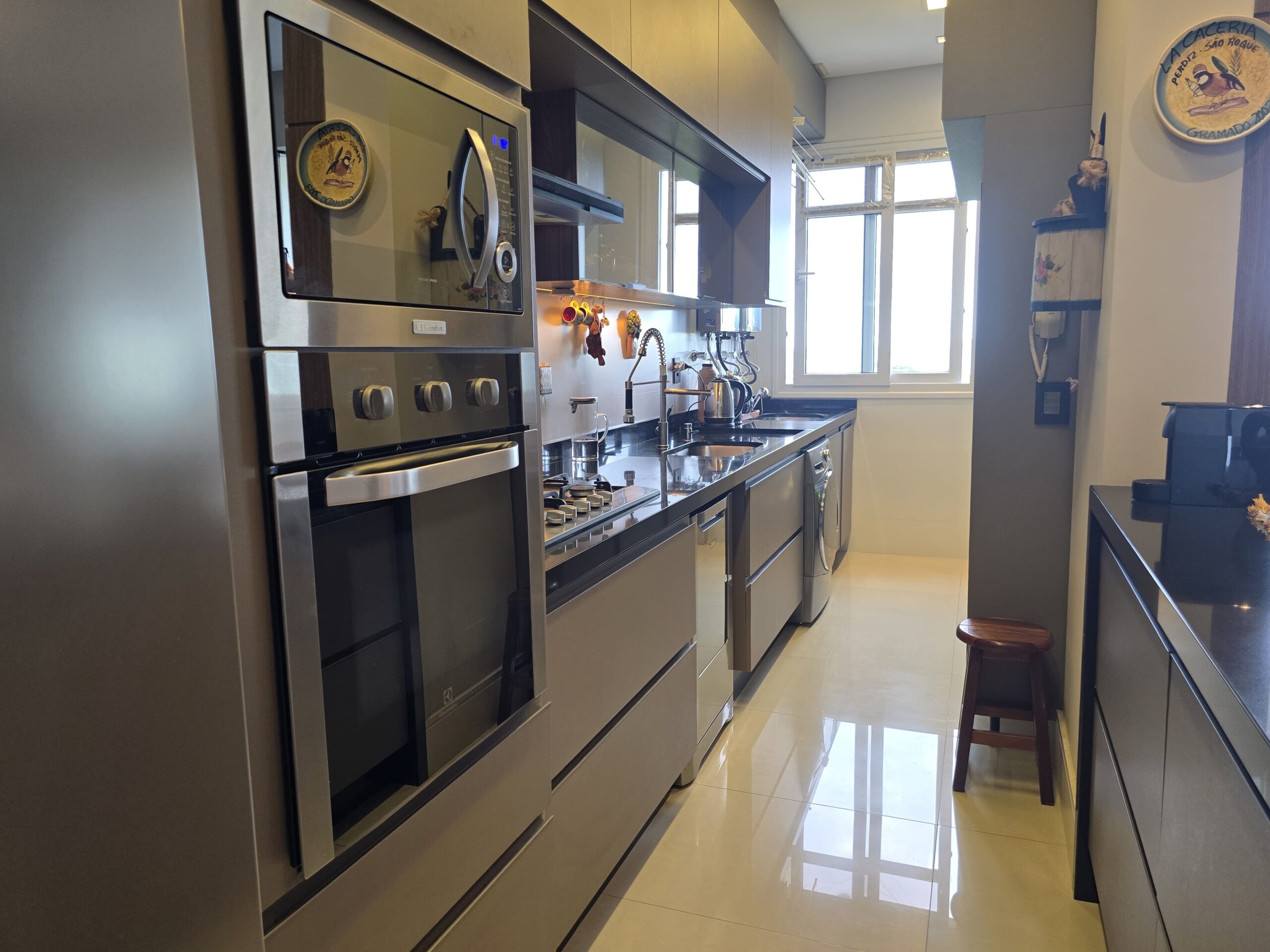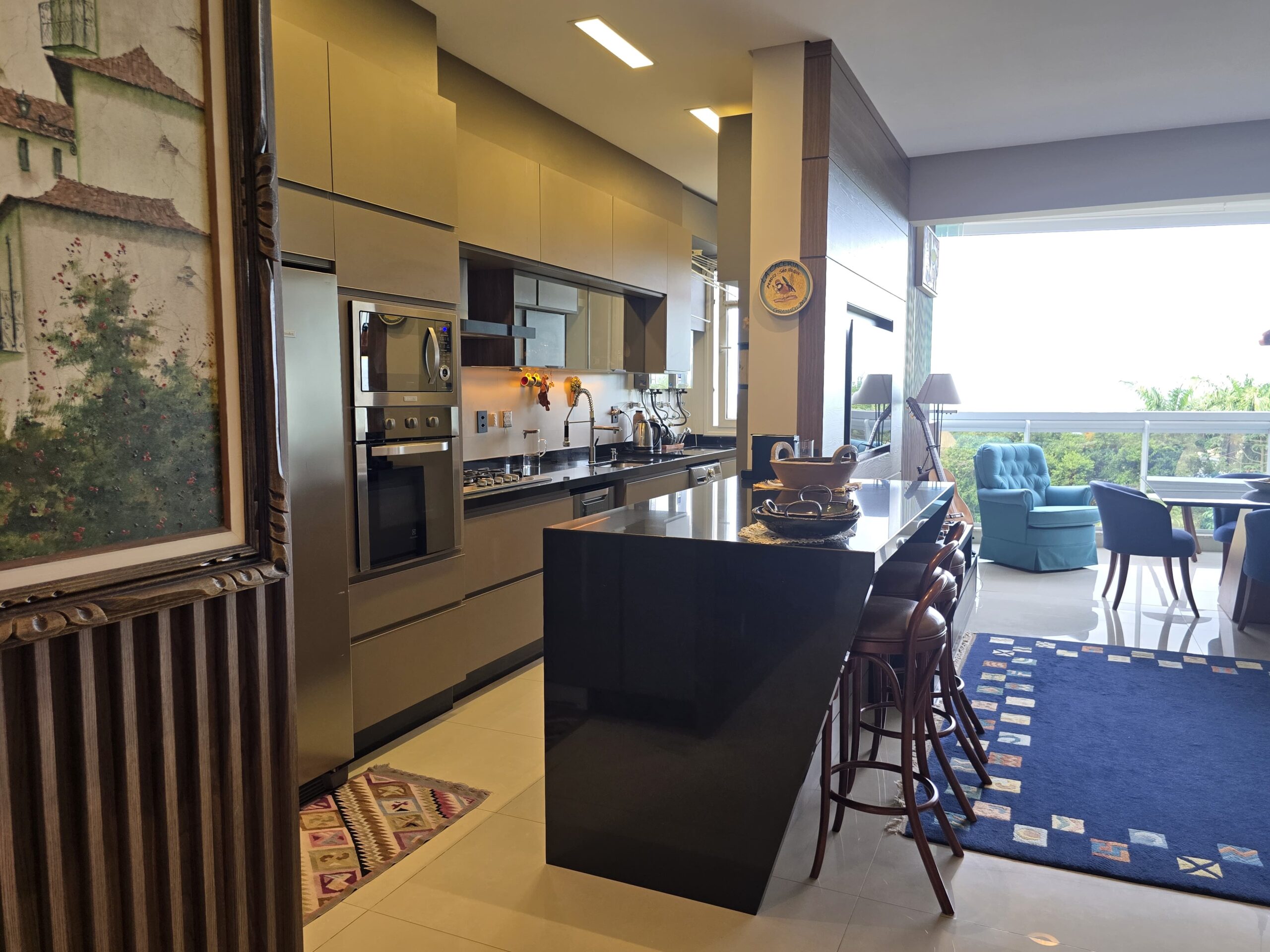 - Cozinha Gourmet Integrada: A sacada, totalmente integrada à sala, se transforma no coração social do apartamento. Equipada com churrasqueira premium e cozinha completa, é o cenário ideal para receber amigos, com a vista para o mar sempre como plano de fundo.